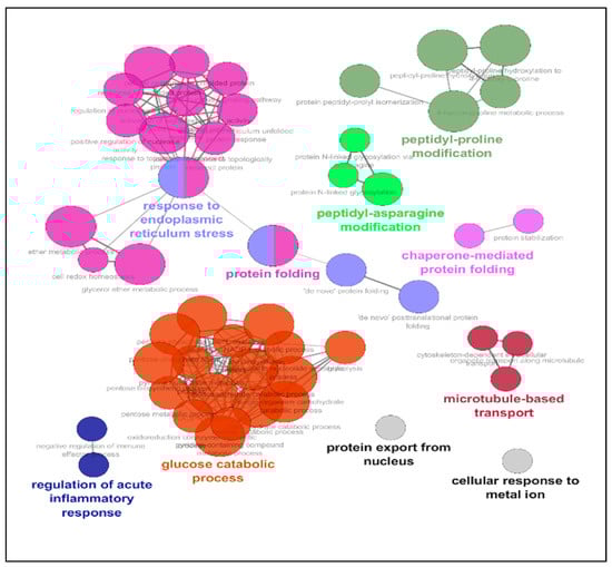 ClueGO Network Representation of unaltered motifs during the full protocol. The list of protein motifs unaffected by the protocol were analyzed in Cytoscape’s ClueGO to identify their ontology and network associations. Results are illustrated as a functionally grouped network of terms/pathways. The most significant term of a group is considered to be the leading terms and is highlighted (bolded name). Disc size represents the number of motifs identified in the specified ontology (small: 3–6; medium: 7–9; large: 10 and more).