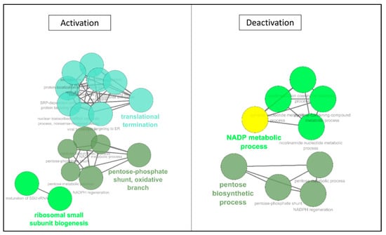 In the first 3 h of the protocol, ontology analysis (Table 2), we observed de novo expression of several proteins, belonging to cytoskeletal structure and cellular adhesion. The majority of changes were detected in the transcription/translation machinery, with ribosomal proteins and RNA and peptide transports. The ionic balance was also concerned by new protein productions. In terms of downregulated motifs, both the energy metabolism and nucleotide biosynthesis were affected, as well as cell surface adhesion and RedOx regulation. Network analysis (Figure 4) confirmed the increased expression of protein motifs involved in RNA maturation (translation and ribosome biogenesis), as well as the impact on the energy metabolism, with the reconfiguration of the pentose biosynthetic process, and decrease of the NADPH metabolic process.