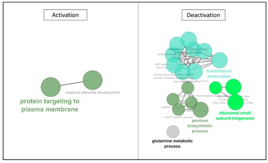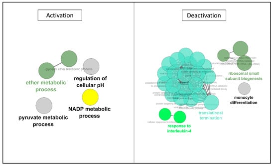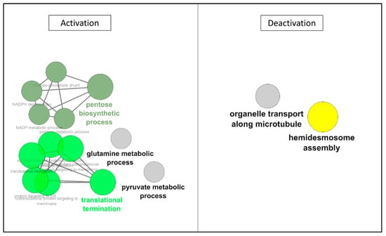 In this time window, the exploration of ontologies (Table 5) showed seemed to be a shift in the cell’s behavior. While there remained a few upregulations, with similar families as previous time windows such as intracellular transport, Transcription/Translation Regulation, and interaction with the environment, here energy metabolism was also concerned. The main alterations are however observed in the downregulated section; with a large number of motifs belonging to families which were upregulated in the first half of the procedure: cytoskeleton, interaction with the environment, intracellular transport, and importantly Transcription/Translation Regulation. Ionic imbalance, Energy metabolism, and RedOx regulation were also implicated. Network analysis (Figure 6) confirmed that activations appeared reduced, limited to cytoskeleton-related networks, whereas deactivations were more widespread, with networks previously upregulated during the first 12 h.