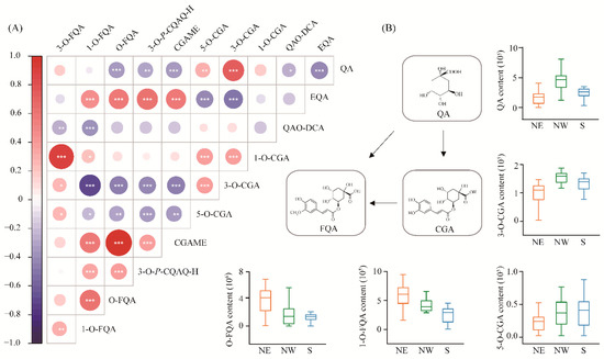 Correlation matrix and subpopulation differentiation of metabolic traits involved in CGA biosynthesis. (A) The features of 11 metabolites were quantitatively detected by high-throughput LC-MS/MS analysis, and the correlation between metabolites is shown. The 11 metabolites were divided into three groups, including the QAs (quinic acid [QA]; eudesmoyl quinic acid [EQA]; and quinic acid O-di-glucuronic acid [QAO-DCA]), CGAs (1-O-chlorogenic acid [1-O-CGA]; 3-O-chlorogenic acid [3-O-CGA]; 5-O-chlorogenic acid [5-O-CGA]; and chlorogenic acid methyl ester [CGAME]), and FQAs (3-O-p-coumaroylquinic acid O-hexoside [3-O-P-CGAO-H]; O-feruloylquinic acid [O-FQA]; 1-O-feruloylquinic acid [1-O-FQA]; and 3-O-feruloylquinic acid [3-O-FQA]). Blue indicates a negative correlation, red indicates a positive correlation, and the size of each circle is proportional to the strength of the correlation (*, p < 0.05; **, p < 0.01; ***, p < 0.001); (B) The metabolic conversion pathway of the three types of metabolites is described. The box plot shows the phenotypic differentiation of five metabolites in three geographic regions, and yellow, green, and blue represent the northeastern (NE), northwestern (NW), and southern (S) regions of China, respectively.