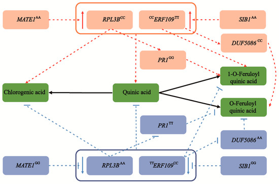 The allelic genetic regulatory network mediated by six causal genes involved in CGA biosynthesis. Two major genes, RPL3B and ERF109, are significantly associated with the chlorogenic acid content, and coordinate the accumulation of quinic acid, chlorogenic acid, and 1-O-ferulylquinic acid. In the eQTN mapping, MATE1 and SIB1 act as the lead trans-eQTN to mediate the expression of RPL3B and ERF109, respectively, and are indirectly involved in the regulation of chlorogenic acid biosynthesis. Meanwhile, RPL3B can also alter the content of 1-O-FQA by affecting the expression level of PR1. Similarly, ERF109 also affects the biosynthesis of O-FQA by regulating the abundance of DUF5086. The superscript of the gene represents the allele of the causal SNP within the gene. The red and blue circles are the dominant alleles and inferior alleles, respectively. However, as a pleiotropic gene, ERF109 shows different allelic variation patterns in chlorogenic acid and 1-O-ferulylquinic acid. The dotted lines represent the regulatory network by eQTN and GWAS analyses, and the black solid line represents the transformation relationship between metabolites. The red and blue arrows represent an increase and decrease, respectively.
