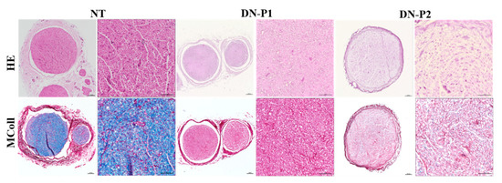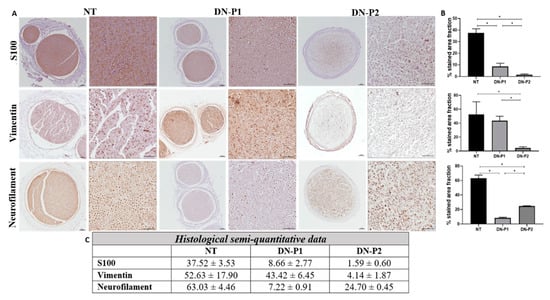 However, immunohistochemical staining for neurofilament (axons) showed a better removal of these neuronal proteins in nerves treated with DN-P1 compared to those treated with DN-P2 (Figure 2A). This data was confirmed also by the semiquantitative analysis where DN-P1 was significantly less compared to native and DN-P2 nerves (Figure 2B,C).