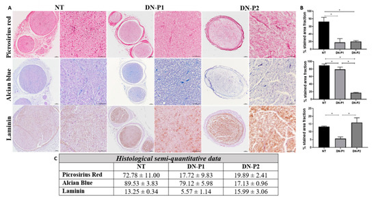 Conservation of the ECM in decellularized nerve is crucial, as they sustain the Schwann cell migration and axonal re-growth. Nerves were histochemically stained with Picrosirius red and Alcian blue to qualitatively evaluate the presence of collagen and acid proteoglycans, respectively (Figure 3A). The semiquantitative analyses revealed that nerves treated with both protocols resulted in a significant reduction of the histochemical reaction against collagens as compared to native nerves (p < 0.05). No significant differences were observed between both the experimental conditions (p = 0.513) (Figure 3B,C). The analysis of the proteoglycans confirmed a clear removal of these non-fibrillar molecules from the epi-, peri-, and endoneurium levels with both the decellularization protocols as compared to native controls (p < 0.05). This reduction was more evident and significant in nerves treated with DN-P2 compared to those treated with DN-P1 (p < 0.05). Furthermore, the basal membrane glycoprotein laminin was also immunohistochemically identified due to its critical role during regeneration. These results revealed a better preservation of these molecules in nerves treated with DN-P2 compared to DN-P1 treated nerves. However, the organization pattern and distribution, obtained after decellularization, differed with respect to the well-delimited basal membranes observed in native nerves (Figure 3A). Laminin quantitative analyses confirmed the significant reduction of the molecule in nerves treated with DN-P1 compared to native and DN-P2 nerves (p < 0.05). Moreover, no statistical differences were observed in nerves treated with DN-P2 compared to the native condition (p = 0.513) (Figure 3B,C).