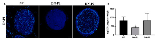 A greater DNA removal was achieved using DN-P1, in which intact nuclei were completely absent, as demonstrated by DAPI staining; this was also found in the Roosens protocol alone or with the addition of genipin [30,32]. While the DNA quantification presented in Roosens protocol [30] achieved a less DNA content, on the other hand, the DNA quantification in DN-P1 and DN-P2 did not reach the limits considered optimal for decellularized tissues (50 ng/dry weight) [7], thus indicating that both protocols were not optimal to completely eliminate DNA, albeit a halved quantity was detected in DN-P1 compared to DN-P2. The decrease noted in DN-P1 compared to DN-P2 could be the effect of the additional DNase treatment in DN-P1, differently from DN-P2 that never applied a DNase treatment.
