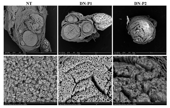 Electron microscopy of the decellularized nerves was performed to detect changes at the nerve ultrastructural level. Nerve samples were analyzed using both scanning (SEM) and transmission electron microscope (TEM) to detect the nerve surface and inner ultrastructure, respectively. SEM analysis demonstrated a very well-preserved ultrastructure of nerves treated with DN-P1 (Figure 5). Indeed, the nerves endoneurial tubes showed a well-organized net-like structure of the ECM in which a well-perforated surface can be seen. Instead, nerves treated with DN-P2 showed a less organized structure, and the net-shaped structure was not well detected. In particular, the ECM appeared severely disrupted. In native nerves, conserved nerve fascicles were easily detectable.