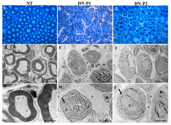 Toluidine blue staining and Ttansmission electron microscopy (TEM) representative panel. Toluidine blue stained sections (A–C) show the overall structure of the decellularized rat sciatic nerves. TEM (D–I) detects the changes in the inner ultrastructure of the native tissue and decellularized nerves. Myelin structures (black arrow), collagen fibers (*), axon remnants (#). (A–C) scale bar = 20 µm; (D–F) scale bar = 5 µm; (G–I) scale bar = 2 µm.
