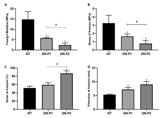 Biomechanical properties of native and decellularized rat sciatic nerves. (A) Young’s modulus (MPa), (B) failure stress (MPa), (C) failure strain (%), and (D) elastic modulus (mm). * indicate statistically significant differences (p < 0.05) of decellularization protocols compared to natives, # indicate statistically significant differences (p ˂ 0.05) between the two decellularization protocols.