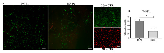 In both methods 2 x104 rADMSCs were seeded in non-coated wells as 2D positive or negative technical controls. To generate 2D negative control, an irreversible cell-membrane and nuclei damage was induced using 2% Triton X-100. WST-1 obtained values from both tested groups; DN-P1 and DN-P2 were normalized to 2D positive control where it represents 100% viability [32].