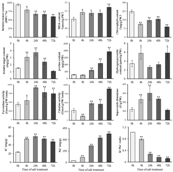 Determination of physiological indexes of S. alopecuroides after salt stress. Vertical bar indicates mean + SD calculated from four replicates. Each variable was statistically compared with the control (t-test analysis) (** p < 0.01, * p < 0.05).