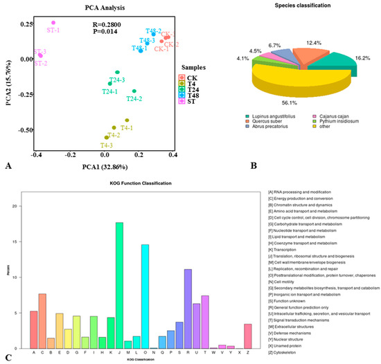Overview of a time course of S. alopecuroides transcriptome responses to salt stress. (A) Principal component analysis (PCA) plots of transcripts identified by RNA-seq of salt-stressed S. alopecuroides roots at 0, 4, 24, 48, and 72 h after stress. (B) Species classification statistics map of the transcriptome NR (NCBI non-redundant protein sequences) library comparison of S. alopecuroides. (C) KOG (euKaryotic Ortholog Groups) annotated classification chart. The X-axis lists the names of the 26 KOG groups, and the Y-axis has the proportion of the number of genes annotated to the group to the total number of genes annotated.