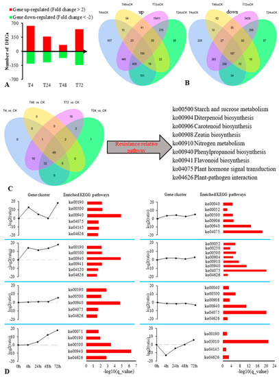 Overview of S. alopecuroides differentially expressed genes (DEGs) annotating the KEGG (Kyoto Encyclopedia of Genes and Genomes) pathway response time with salt stress. (A) Number of individual transcripts significantly upregulated or downregulated at each time point. (B) Venn diagram illustrating the number of transcripts upregulated or downregulated by salt stress over the time course. (C) Venn diagram showing the overlap of common and unique pathways present in the transcriptome following 4, 24, 48, and 72 h post salt stress. (D) Time sequence transcriptomic analysis of salt stress inducing significant DEGs in the roots of S. alopecuroides. The KEGG pathways for each profile are listed on the right. Enrichment scores are shown as −log10(q).