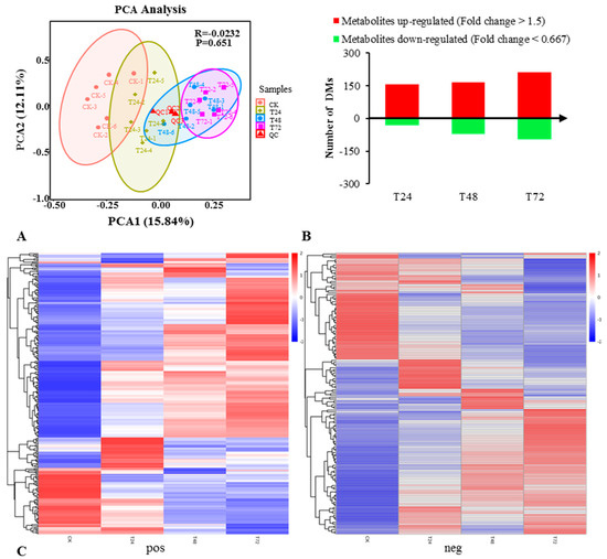 Overview of a time course of S. alopecuroides metabolome responses to salt stress. (A) PCA plots of metabolites identified by UHPLC (Ultra Performance Liquid Chromatography and High Resolution Mass Spectrometry)-MS/MS of salt-stressed S. alopecuroides roots at 0, 24, 48, and 72 h after stress. (B) Number of individual metabolites significantly upregulated or downregulated at each time point. (C) Clustering heat map of total difference metabolites (the left frame is the positive ion mode, the right frame is the negative ion mode). The longitudinal direction is the clustering of samples, and the shorter the cluster branches, the higher the similarity.