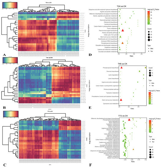 The correlation analysis was performed using Pearson’s correlation coefficient in the R language mixOmics package to calculate the correlation coefficient r2 and the p-value of differentially expressed genes and differential metabolites. All differentially expressed genes and differential metabolites obtained in T24_vs_CK, T48_vs_CK, and T72_vs_CK were mapped to the KEGG database to obtain their common pathway information and perform statistical analysis.