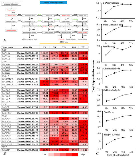 Overview of the relationship between DEGs and DMs in the lignin synthesis pathway (LSP) of S. alopecuroides under salt stress. (A) Overview of lignin biosynthesis. (B) Heat map of lignin biosynthesis-related gene expression. Values are Average FPKM value of each sample in each group. PAL, phenylalanine ammonia-lyase; C4H, trans-cinnamate 4-monooxygenase; COMT, caffeic acid 3-O-methyltransferase; 4CL, 4-coumarate–CoA ligase; CCR, cinnamoyl-CoA reductase; CADH, cinnamyl alcohol dehydrogenase; POD, peroxidase; UGT, coniferyl-alcohol glucosyltransferase. (C) The trend of lignin synthesis pathway DMs changes with salt stress. Expression scores are shown as log10(q).