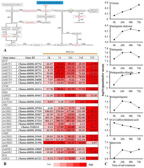 Flavonoids are among the main secondary metabolites of plants and play an important role in the response of plants to abiotic stress. The combined transcriptomic and metabolomic analysis revealed that 24 DEGs, including shikimate O-hydroxycinnamoyltransferase (HCT), chalcone synthase (CHS), chalcone isomerase (CHIS), coumaroylquinate (coumaroylshikimate) 3′-monooxygenase (CYM), flavonoid 3′,5′-hydroxylase (FHD), flavonol synthase (FLS), anthocyanidin reductase (ANR), and leucoanthocyanidin dioxygenase (ANS), were obtained in the FSP (Figure 7A,B). The seven different metabolites were naringenin chalcone, naringenin, vitexin, 5-O-caffeoylshikimic acid, isoliquiritigenin, pelargonidin chloride, and quercetin (Figure 7C). Seven DEGs belonged to the HCT; these were initially upregulated, then downregulated, and finally upregulated, while they exhibited the highest expression levels at 4 h and 72 h. Eight DEGs were obtained from the CHS family; their expression level trend was consistent with that of the HCT family, but the expression level of each gene was the highest at 24 and 72 h. This result indicates that there were differences in the timing of the response of different genes to salt stress, which may be caused by differences in the expression order of different genes in response to salt stress.