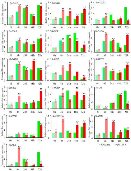 To further verify the dynamic expression of DEGs in response to salt stress and the reliability of the transcriptomic results, we selected SaPAL2, SaC4H3, SaCOMT1, Sa4CL3, SaCCR, SaCADH, SaPOD5, SaUGT, SaHCT2, SaCYM, SaFHD, SaANS, SaCHS5, SaCHIS2, SaANR2, and SaFLS for qRT-PCR verification (Figure 8). The qRT-PCR results were consistent with the transcriptomic analysis results.