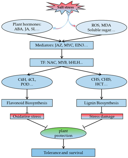 As fixed organisms, plants cannot escape the external environment or its negative influences [5]. Plants can only adapt to the environment by changing their forms [5]. Salt stress originating in soil forces plants to evolve an adaptive system, which includes various physiological and biochemical mechanisms, which are collectively known as the plant salt stress response [8]. Thus far, the plant salt stress response components that have been discovered include ion homeostasis and division, ion transport and absorption, osmotic protectant biosynthesis, antioxidant enzyme and antioxidant compound synthesis, the synthesis of active molecules such as polyamines, hormone regulation, and changes in membrane structure [9,10]. The accumulation of a variety of soluble osmotic adjustment substances under salt stress conditions can reduce water loss under short-term osmotic stress, enhance cell turgor, stabilize cell structure under long-term osmotic stress conditions, and facilitate the continuous growth of cells [11]. The ROS produced by plants under salt stress can activate enzymatic and non-enzymatic systems to alleviate oxidative stress [12]. The enzyme system consists of antioxidant enzymes, such as peroxidase (POD), catalase (CAT), superoxide dismutase (SOD), glutathione reductase (GR), and glutathione S-transferase (GST), which remove the ROS system [13]. Non-enzymatic systems are metabolites produced in response to salt stress and include ascorbic acid, alkaloids, flavonoids, carotenoids, glutathione, and phenolic compounds [8,13,14]. The role played by the enzymatic and the non-enzymatic systems is mainly to eliminate ROS to reduce its damage to plant cells and improve the antioxidant capacity of plants [12,14]. The products of the phenylpropane metabolic pathway play a certain role in the process of eliminating ROS. The three hydroxycinnamyl alcohol precursors in the phenylpropanoid biosynthesis (PHB) pathway, namely p-coumaroyl, coniferyl alcohol, and sinapyl alcohol, derive p-hydroxybenzyl (H-lignin), guaiacyl (G-lignin), and syringyl lignin (S-lignin), respectively [15]. Lignin, a product of lignin synthesis pathway (LSP), is a dietary fiber that is insoluble in water. The lignin content in plants is second only to cellulose, and it affects plants’ tolerance to abiotic stress [16]. Flavonoids are derivatives of chalcones, such as flavanones (e.g., naringenin), flavonols (e.g., quercetin), isoflavones (e.g., formononetin), and others [17]. A variety of different chemical classes of flavonoids directly or indirectly participate in signal transduction pathways that regulate oxidative stress and cell survival to varying degrees [18]. Flavonoids have a wide range of physiological functions in the tolerance response of plants to abiotic stress, and they play an important role in the elimination of hydrogen peroxide and ROS [19,20,21,22]. Chalcone synthase (CHS), chalcone isomerase (CHI), and cytochrome P450 monooxygenase (CPM) are key enzymes in the flavonoid synthesis pathway (FSP) and play key roles in plant salt stress [23,24,25]. Arabidopsis AtCHS and soybean GmCHS play positive regulatory roles in plant responses to salt stress, while CPM and CHI play negative regulatory roles [26]. Studies have found that genes in the PHB pathway are involved in the process of plant response to salt stress, but there are few reports on the changes of each gene in response to plant response to salt stress and the relationship between each gene [23,24,25,26].
