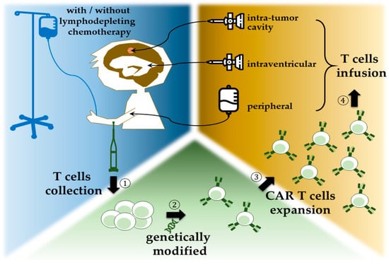 Protocol of CAR T-cell therapy: (1) T cells are gathered from patient. (2) CAR structure is engineered into the collected T cells. (3) The modified CAR T cells are augmented to sufficient amounts. (4) CAR T cells are infused back into the patient via either catheter into intratumor cavity or intraventricular, or through peripheral infusion.