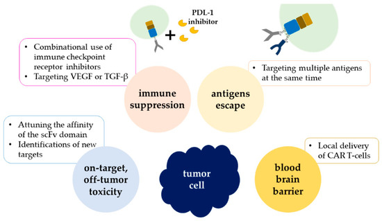 As heterogeneity of antigen expression is observed in most brain tumors, targeting multiple antigens is demonstrated to increase antitumor potency and lower the possibility of tumor antigen escape [70]. The use of trivalent targets to EphA2, HER2, and IL-13Rα2 of CAR T cells exhibited benefits in preclinical models of recurrent medulloblastoma, GBM, and ependymomas [71,72]. In a murine GBM model, simultaneously targeting HER2 and IL-13Rα2 showed better tumor control [70,73]. As a trivalent vaccine targeting EphA2, HER2, and IL-13Rα2 in pediatric malignant gliomas [74] and ependymomas [75] revealed feasibility, tolerability, and efficacy pediatric brain tumors, combination of targeted antigens might be the future direction of the development of CAR T-cell therapy.