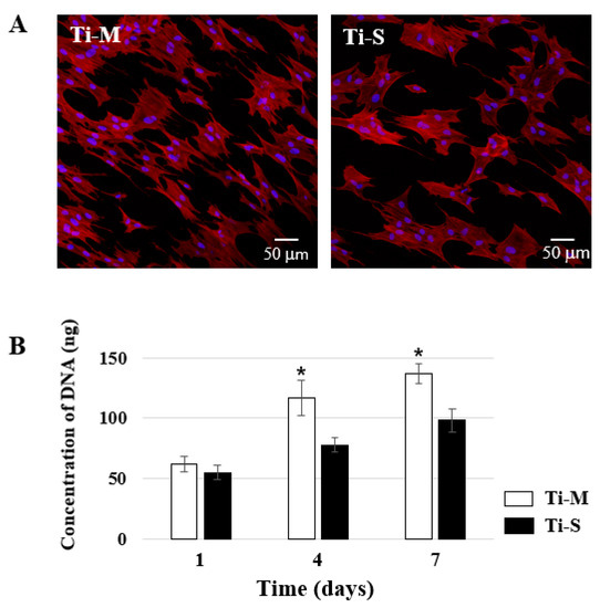 Cell morphology and proliferation. (A) Microscopic observation at 24 h after MC3T3-E1 cells were seeded on Ti discs. Blue and red fluorescence indicate the nucleus and cytoskeleton of the cell, respectively. Original magnification is 300× and scale bar = 50 μm. (B) PicoGreen™ assay (cell proliferation assay) of MC3T3-E1 cells at 1, 4, and 7 days after cell seeding. Data are expressed as mean ± SD of three independent experiments. * Significant differences between groups (p < 0.05).