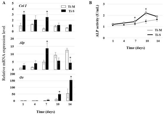 The cells on the discs were harvested 1, 4, 7, 10 and 14 days after the induction of osteoblast differentiation in the osteogenic medium. Real-time polymerase chain reaction (PCR) was performed to evaluate the expression of the bone marker genes type I collagen (Col I), alkaline phosphatase (Alp), and osteocalcin (Oc) (Figure 3A). The expression of Col I was higher on the Ti-S discs than on the Ti-M discs. This was true for all the investigated time points, with the Alp expression on the Ti-S discs peaking on the seventh day before that on the Ti-M discs. There was little difference in the expression of Oc in the early stages until the seventh day. Thereafter, the increase was more pronounced on the Ti-S discs than on the Ti-M discs. The Alp activity assay showed well-differentiated patterns on both types of surfaces, but the osteoblast differentiation on the Ti-S discs was faster than that on the Ti-M discs (Figure 3B).