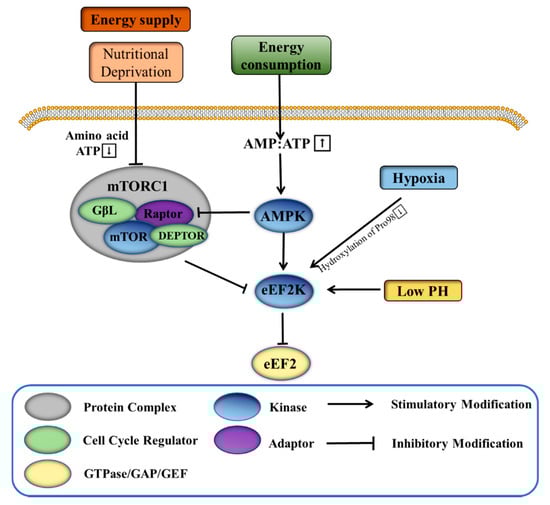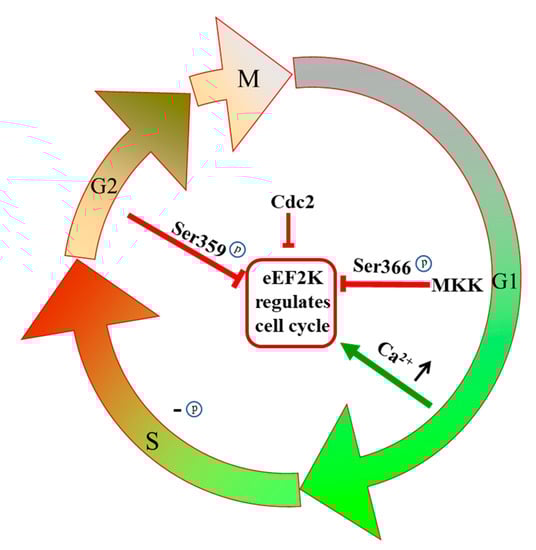 - Smith, E.M.; Proud, C.G. cdc2–cyclin B regulates eEF2 kinase activity in a cell cycle- and amino acid-dependent manner. EMBO J. 2008, 27, 1005–1016. [Google Scholar] [CrossRef] [PubMed]