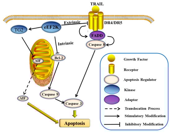 - Zhang, Y.; Cheng, Y.; Zhang, L.; Ren, X.C.; Huber-Keener, K.J.; Lee, S.; Yun, J.; Wang, H.G.; Yang, J.M. Inhibition of eEF-2 kinase sensitizes human glioma cells to TRAIL and down-regulates Bcl-xL expression. Biochem. Biophys. Res. Commun. 2011, 414, 129–134. [Google Scholar] [CrossRef] [PubMed]