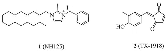 - Chen, Z.; Gopalakrishnan, S.M.; Bui, M.H.; Soni, N.B.; Warrior, U.; Johnson, E.F.; Donnelly, J.B.; Glaser, K.B. 1-Benzyl-3-cetyl-2-methylimidazolium iodide (NH125) induces phosphorylation of eukaryotic elongation factor-2 (eEF2). J. Biol. Chem. 2011, 286, 43951–43958. [Google Scholar] [CrossRef]