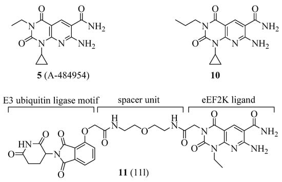 - Liu, Y.; Zhen, Y.; Wang, G.; Yang, G.; Fu, L.; Liu, B.; Ouyang, L. Designing an eEF2K-Targeting PROTAC small molecule that induces apoptosis in MDA-MB-231 cells. Eur. J. Med. Chem. 2020, 204, 112505. [Google Scholar] [CrossRef]