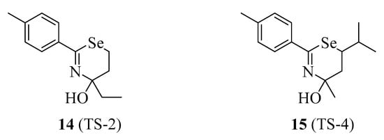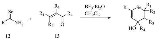 - Koketsu, M.; Senda, T.; Yoshimura, K.; Ishihara, H. Synthesis and characterization of novel 1,3-selenazine derivatives. BF3·Et2O-assisted reaction of primary selenoamides with α,β-unsaturated ketones. J. Chem. Soc. Perkin Trans. 1999, 1, 453–456. [Google Scholar] [CrossRef]