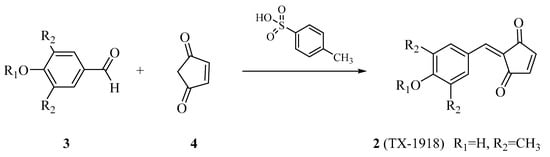 - Hori, H.; Nagasawa, H.; Ishibashi, M.; Uto, Y.; Hirata, A.; Saijo, K.; Ohkura, K.; Kirk, K.L.; Uehara, Y. TX-1123: An antitumor 2-hydroxyarylidene-4-cyclopentene-1,3-dione as a protein tyrosine kinase inhibitor having low mitochondrial toxicity. Bioorg. Med. Chem. 2002, 10, 3257–3265. [Google Scholar] [CrossRef]