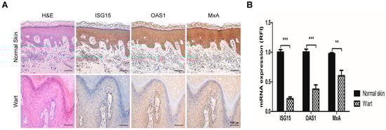 Expressions of interferon-stimulated genes in cutaneous wart samples. (A) Representatively image of hematoxylin and eosin staining (H&E) and immunohistochemical staining for interferon-stimulated gene 15 (ISG15), 2′-5′-oligoadenylate synthetase 1 (OAS1), and myxovirus-resistant protein A (MxA) in wart and normal skin samples. Original magnification = 200×, scale bar = 100 μm. (B) RT-qPCR analysis of interferon-stimulated genes in wart and normal skin samples. Number of wart samples = 6, number of normal skin samples = 5. The relative mRNA levels were normalized to that of GAPDH. The results are expressed as means ± SEM of three independent experiments. ** p < 0.01, *** p < 0.001 compared with normal skin.