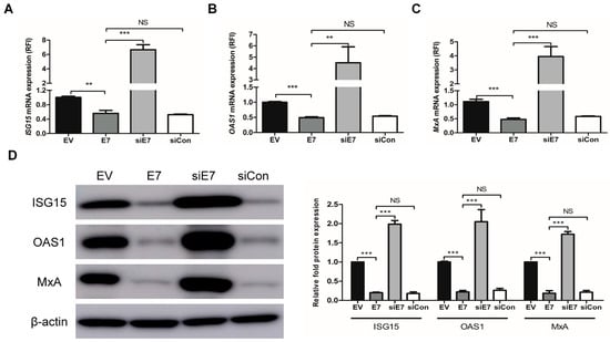 Effect of HPV-2 E7 transfection on the expressions of interferon-stimulated genes. HaCaT cells were transfected with empty vector, E7, E7 specific siRNA, and negative control siRNA (siCon). After transfection, mRNA expression levels of ISG15 (A), OAS1 (B), and MxA (C) were analyzed by RT-qPCR. The relative mRNA levels were normalized against levels of GAPDH. (D) Protein expression levels of ISG15, OAS1, and MxA were evaluated by western blot. The histogram shows quantitative representation of the protein levels of ISG15, OAS1, and MxA obtained from a densitometric analysis. β-actin served as a loading control for protein normalization. The data are shown as the means ± SEM of at least three independent experiments. ** p < 0.01, *** p < 0.001 compared with empty vector or E7. NS, non-significant.