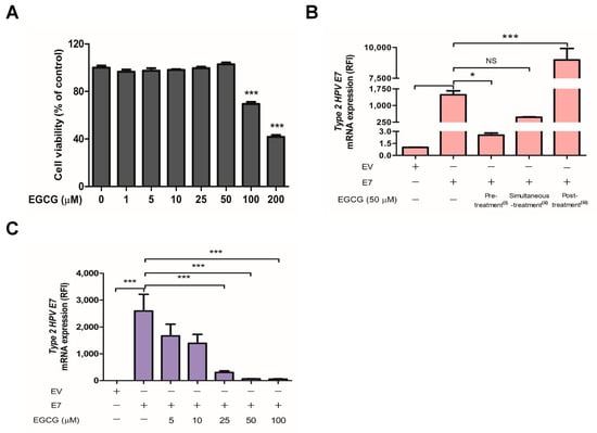 Effect of EGCG treatment against HPV-2 E7 transfection. (A) EGCG toxicity in HaCaT cells. Cells were cultured in serum-free DMEM for 24 h, and then treated with EGCG at the indicated concentrations for 24 h. Cell viability was measured using MTT assay and expressed as a percentage of the value for untreated cells. The results are the mean ± SEM for three independent experiments. *** p < 0.001 compared with untreated cells. (B) HaCaT cells were incubated (i) with 50 μM EGCG for 2 h before HPV-2 E7 transfection, then removed and performed transfection (Pre-treatment), (ii) with 50 μM EGCG for 24 h during transfection, then the EGCG and HPV-2 E7 were removed (Simultaneous-treatment), or (iii) with 50 μM EGCG for 24 h after HPV-2 E7 transfection and removal, then the EGCG was removed (Post-treatment). RNA was extracted from cells of the three groups and HPV-2 E7 mRNA levels measured and expressed as a relative fold increase on the EGCG untreated controls. (C) HaCaT cells were treated with the indicated concentrations of EGCG for 2 h prior to E7 transfection. After transfection, total RNA extracted from cells was subjected to RT-qPCR for mRNA levels of HPV-2 E7. The relative mRNA levels were normalized against levels of GAPDH. The results are the mean ± SEM for three independent experiments. * p < 0.05, *** p < 0.001 compared with empty vector or E7. NS, non-significant.