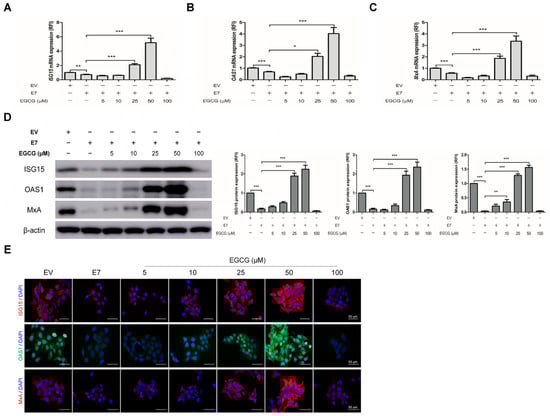 Effect of EGCG pretreatment on the expressions of interferon-stimulated genes in HPV-2 E7 transfected cells. HaCaT cells were pretreated with EGCG at the indicated concentrations for 2 h before transfection, then the pretreated cells were transfected with empty vector or HPV-2 E7. (A–C) Total RNA extracted from cells after 24 h transfection was subjected to the RT-qPCR for the mRNA levels of ISG15 (A), OAS1 (B), and MxA (C). The data are expressed target mRNA levels relative fold to the empty vector. The relative mRNA levels were normalized against levels of GAPDH. (D) Cell lysates were collected for western blot to measure the ISG15, OAS1, and MxA expressions in cells pretreated with EGCG. The graph indicates quantitative representation of the protein levels of ISG15, OAS1, and MxA obtained from a densitometric analysis. β-actin served as a loading control for protein normalization. The results are expressed as the mean ± SEM of three independent experiments. * p < 0.05, ** p < 0.01, *** p < 0.001 compared with empty vector or E7. (E) Representatively image of immunofluorescent staining of ISG15 and MxA (red), OAS1 (green) in pretreated cell with EGCG. DAPI (blue) was used to counterstain nuclei. Images by fluorescent microscope with 400× magnification, scale bars = 50 μm.