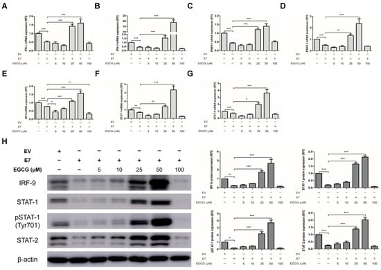 Effect of EGCG pretreatment on the expressions of type I interferon signaling pathway components in HPV-2 E7 transfected cells. HaCaT cells were treated with EGCG at the indicated concentrations for 2 h prior to E7 transfection. Following pretreatment with EGCG, the cells were transfected with empty vector or HPV-2 E7. (A–G) Total RNA extracted from cells after 24 h transfection was subjected to the RT-qPCR for the mRNA levels of IFN-α (A), IFN-β (B), IFNAR-1 (C), IFNAR-2 (D), IRF-9 (E), STAT-1 (F), and STAT-2 (G). The relative mRNA levels were normalized against levels of GAPDH. (H) The protein levels of IRF-9, STAT-1, STAT-2, and tyrosine phosphorylation STAT-1 were measured using western blot analysis. The graph indicates quantitative representation of the protein levels of U-ISGF-3 components obtained from a densitometric analysis. β-actin served as a loading control for protein normalization. The results are expressed as the mean ± SEM of three independent experiments. * p < 0.05, ** p < 0.01, *** p < 0.001 compared with empty vector or E7.