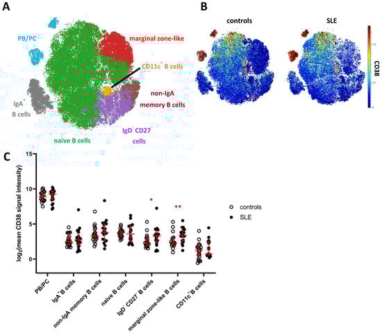- Jacobi, A.M.; Mei, H.; Hoyer, B.F.; Mumtaz, I.M.; Thiele, K.; Radbruch, A.; Burmester, G.-R.; Hiepe, F.; Dörner, T. HLA-DRhigh/CD27high plasmablasts indicate active disease in patients with systemic lupus erythematosus. Ann. Rheum. Dis. 2009, 69, 305–308. [Google Scholar] [CrossRef]