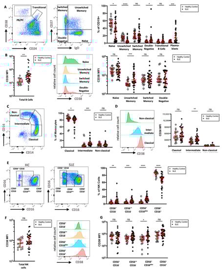 Burns, M.; Ostendorf, L.; Biesen, R.; Grützkau, A.; Hiepe, F.; Mei, H.E.; Alexander, T. Dysregulated CD38 Expression on Peripheral Blood Immune Cell Subsets in SLE. Int. J. Mol. Sci. 2021, 22, 2424. https://doi.org/10.3390/ijms22052424