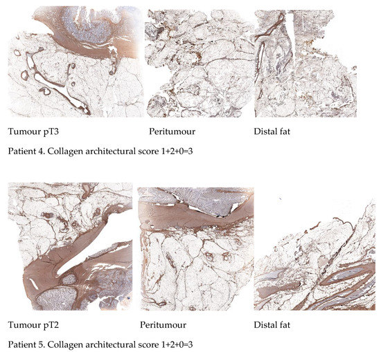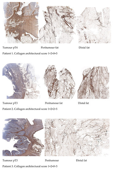 2.5. Differential Immunohistochemical Expression of COL1A1 in Colon Cancer Tissue, Peritumour Mesenteric Adipose Tissue and Distal Adipose Tissue