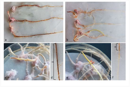Seedling shoots and roots showing necrotic areas caused by infection with Fusarium verticillioides wild-type (wt) or fum1 deletion mutant (fum1∆) strains. (a) wt and (b) fum1∆ infected seedlings at 14 days after infection (dai); close view of typical shoots and the necrotic portion of the roots in wt-(c,d) and in fum1∆ infected seedlings (e,f) with (the necrotic areas are indicated by the arrows—in the shoots—and between brackets—in the roots).