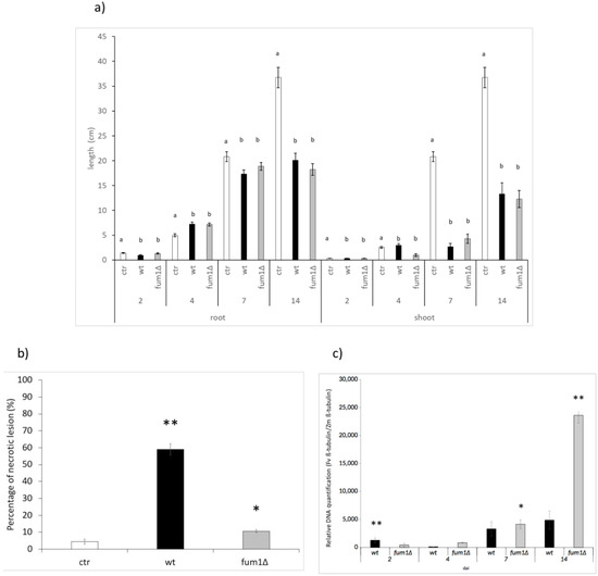 (a) Root and stem elongation in maize kernels mock-infected (ctr) or infected with F. verticillioides wild-type (wt) or mutant (fum1∆) after 2, 4, 7, and 14 days after infection (dai). Data are presented as the mean from two experiments, n = 20 seeds, results are the mean ± std error. Significance (p ≤ 0.05) was assessed by one-way ANOVA followed by Tukey’s test (groupings indicated by a,b). (b) number of roots showings symptoms of necrosis at 14 dai in the non-infected control (ctr), wt, and fum1∆ infected seedlings. (c) DNA extracted from infected and non-infected seedlings at 2, 4, 7, and 14 dai was examined by qPCR with primers specific to F. verticillioides and Z. mays genes coding for β-tubulin. Total height of each bar indicates the quantity of fungal DNA relative to the total DNA detected. Asterisks indicate a significant difference at same time point from ctr in (b) and from the wt in (c) (Student’s t-test: * p < 0.05; ** p < 0.01).