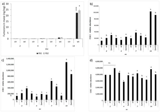 Toxin and fatty acid content were evaluated in seedlings non-infected (ctr) and infected by wild-type (wt), or by fum1 deletion mutant (fum1∆). (a) Fumonisins (FB1 and FB2) in wt-infected and in the ctr seedlings at several days after infection (dai) analyzed by an MRM (Multiple Reaction Monitoring) approach with HPLC–MS/MS. The error bars represent standard error calculated from three independent replicates, technically repeated in triplicate. Asterisks indicate a significant difference at same time point from ctr (Student’s t-test: * p < 0.05; *** p < 0.001). (b) C16:1 (c) C18:0 (d) C18:2 fatty acids in infected (wt or fum1∆) and ctr seedlings at several dai analyzed by a single ion monitoring (SIM) with HPLC–MS/MS. The error bars represent standard error calculated from three independent replicates, technically repeated in triplicate. Significance (p ≤ 0.05) was assessed by one-way ANOVA followed by Tukey’s test.