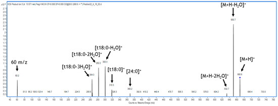 Chromatographic separation of sphingolipids was performed with a Zorbax SB-C8 rapid resolution HT 2.1 × 50 mm 1.8 µm 600 bar column (Agilent Technologies, Santa Clara, CA, USA). The mobile phases consisted of A phase (water: B phase 40:60 v/v, containing ammonium formate 5 mM), B phase (methanol: acetonitrile: isopropyl alcohol 70:20:10 v/v). The elution program was as follows: 0–6 min 20% B, 6–14 min 98% B, 14–18 min 98% B, 18–20 min 100% B, 18–20 min 100% B, 20–22 min 100% B, 22–26 min 20% B, and 26–28 min 20% B. The flow rate was 0.6 mL/min. The column was warmed at 60 °C. The injection volume was 10 µL. HPLC–MS/MS method to identify the molecular structures of sphingolipids from biological sources was previously introduced by Sugawara et al. (2010) [56]. Sphingolipids were identified using multiple reaction monitoring (MRM) (Figure S1).