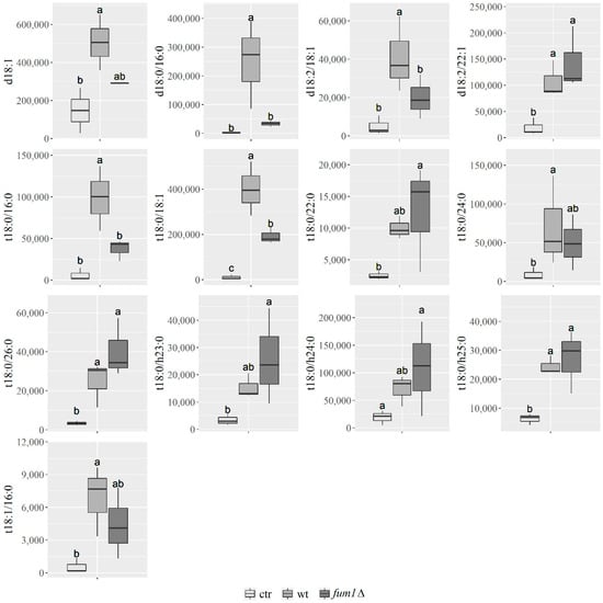 As noted, FBs, which F. verticillioides may produce while infecting maize, can inhibit the enzyme CerS and disrupt plant sphingolipid synthesis. Therefore, we reasoned that comparing lipids present in maize infected with an FB non-producing strain (fum1∆) and a producing strain (wild-type) would reveal the affected lipid species (Figure 3b–d). HPLC–MS/MS and statistical analysis of maize seedlings mock-infected (ctr) and infected with the wild-type or fum1∆ strains revealed that the presence and quantity of 13 sphingolipids were significantly different during the infection process (Figure S2). Maximal differences were observed at 14 dai (Figure 5). Sphingosine d18:1 has already demonstrated closely linked to PCD Arabidopsis [21], and our result in maize confirm this (Figure 5). Dihydroxy and trihydroxy LCFA containing sphingolipids (S-LCFAs) d18:0/16:0 (Figure 5), d18:2/18:1 (Figure 5), t18:0/16:0 (Figure 5), t18:1/16:0 (Figure 5) are similar in maize infected with the fum1∆ strain or mock-infected and significantly greater in the wild-type-infected maize at 14 dai, and the VLCFA sphingolipid (S-VLCFA) t18:0/24:0 (Figure 5). The presence of FB synthesis can positively act on the synthesis of these sphingolipids. S-VLCFAs t18:2/22:0 (Figure 5), t18:0/26:0 (Figure 5), t18:0/h23:0 (Figure 5), and t18:0/h24:0 (Figure 5) increase in the maize kernel infected with fum1∆ strain, suggesting that they are impacted by the presence of FBs, inhibiting the site of ceramide synthases.