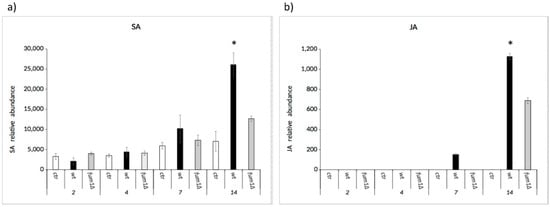 SA and JA seem to have a synergistic or antagonistic interaction in plant disease and immune responses. Here we noted that SA accumulation started early after infection and continued through 14 dai (Figure 6a), while JA was present only at 7 dai and 14 dai (Figure 6b). However, the amount of JA and SA only became significant at 14 dai, when they were greater in wild-type-infected seedlings than they were in either the ctr and fum1∆-infected seedlings. These results suggest that the concentration of JA and SA is dependent on the increase in fumonisins and that the synergic accumulation at 14 dai may be linked to the necrotrophic lifestyle.