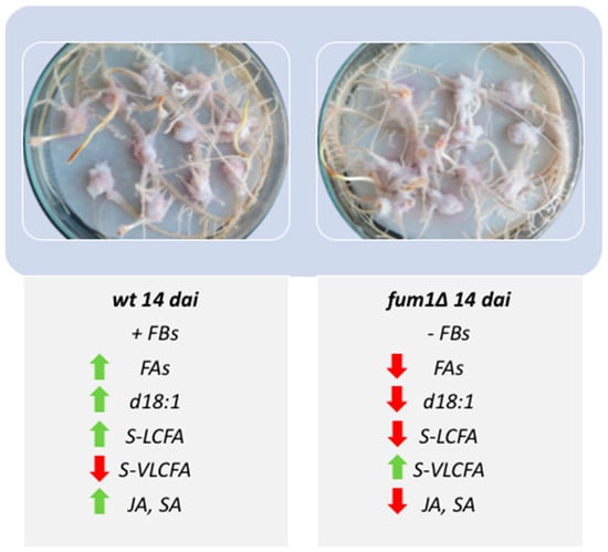 Seedlings infected at 14 dai with F. verticillioides wild-type (wt) or fum1 deletion mutant (fum1∆) strains. Lipids, hormones, and genes are accompanied by the green or red arrow to indicate the relative increase or decrease.