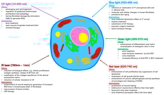 Summary of the most important properties and effects on the cell of various wavelengths of light. AGEs—advanced glycation end-products; ALA-PDT—aminolevulinic acid photodynamic therapy; BCC—basal cell carcinoma; bFGF—basic fibroblast growth factor; GF—growth factor; HMME-PDT—hematoporphyrin monomethyl ether photodynamic therapy, LED—light-emitting diode, ROS—reactive oxygen species.