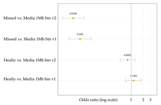 Read numbers and CNVs were counted and visualized along the whole genome according to 1 Mb bin size because of the low sequencing coverage. The number of read counts served as the basis for calculating the ploidy. The Cn.MOPS algorithm was used to predict chromosomal alterations in our dataset. After the CNV detection step odds ratios (OR) were calculated, between missed, healthy and control media groups, according to two different methods: v1—when overall CNV occurrence was counted as one main simple event on a chromosome in order to reduce the bias caused by the false positives; and v2—when every single CNV was counted separately on a chromosome. Both OR calculation methods (v1 and v2) confirmed statistically significant differences between the culture media droplets of aborted embryos (“Missed”) and the control media (“Media”) (Figure 3). In contrast, the statistical test between the culture media droplets of healthy neonates (“Healthy”) and the control media (“Media”) was not found to be significant. The main reason for this outcome could arise from the fact that the gDNA features, like fragmentation and quality, of the healthy and culture media groups were very similar, therefore we could not identify any clinically relevant alternation. Moreover, this is supported by the difference in the embryonic gDNA content and quality found in the culture media droplets of the cleavage-stage embryos that developed to healthy neonates compared to the group of embryos that were aborted. Evaluable results could be predicted only from the missed aborted embryos.
