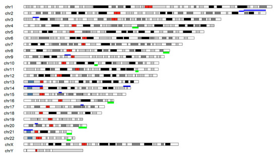 Karyogram representing clinically relevant autosomal alterations identified based on the NGS analysis of the gDNA content from the culture media of the aborted embryos. Dark red bands showing the centromeres, green bands above the chromosomes are indication gains and dark blue bands showing losses.