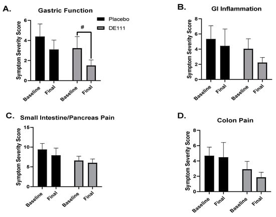Symptom severity scores were based on answers to a GI symptom questionnaire by Metagenics [16] that is designed to provide a functional measure to assess symptoms associated with gastric function (A), gastrointestinal inflammation (B), small intestine/pancreas pain (C), and colon pain (D). Error bars represent ±SEM, # indicates a statistical trend (p = 0.051–0.08).